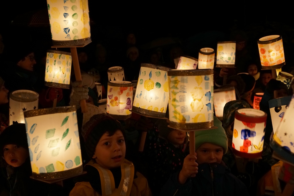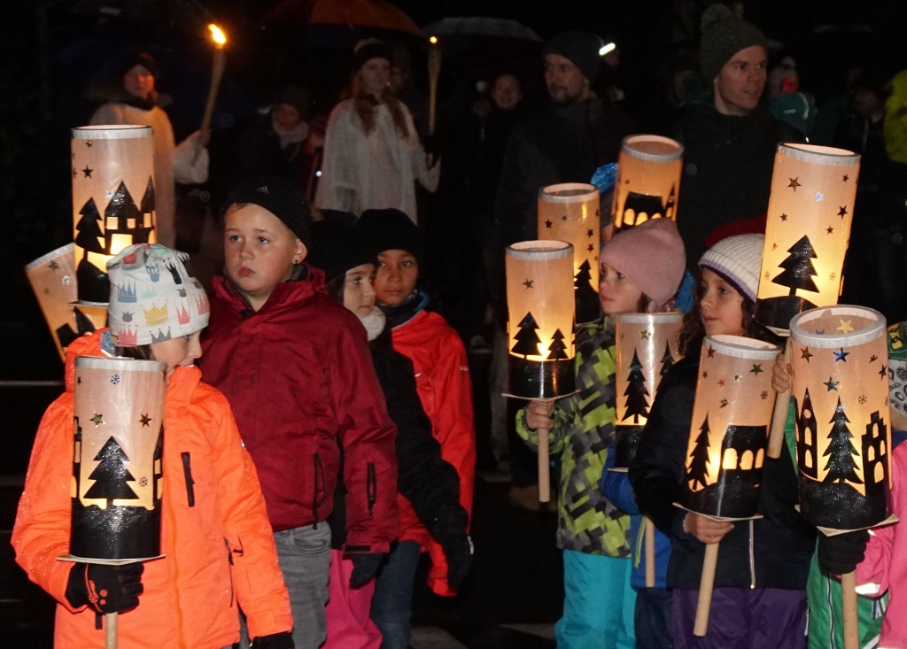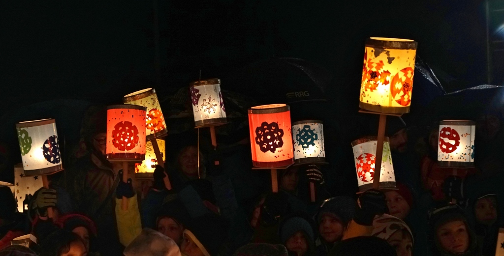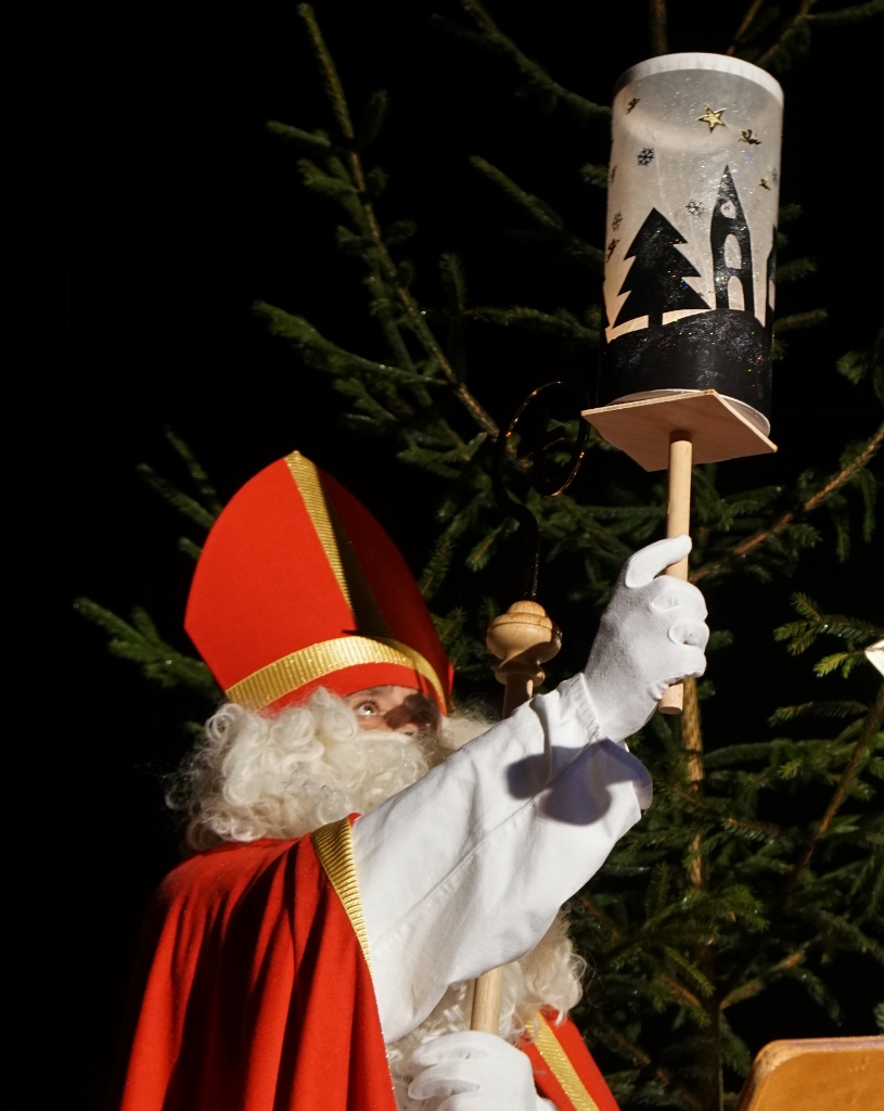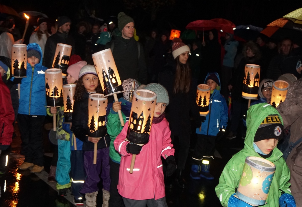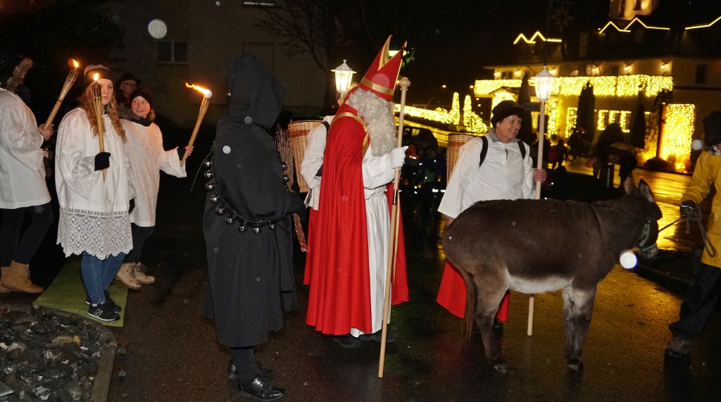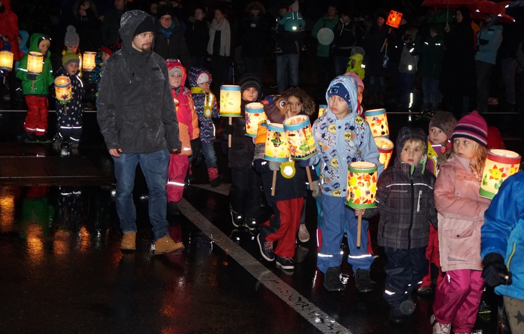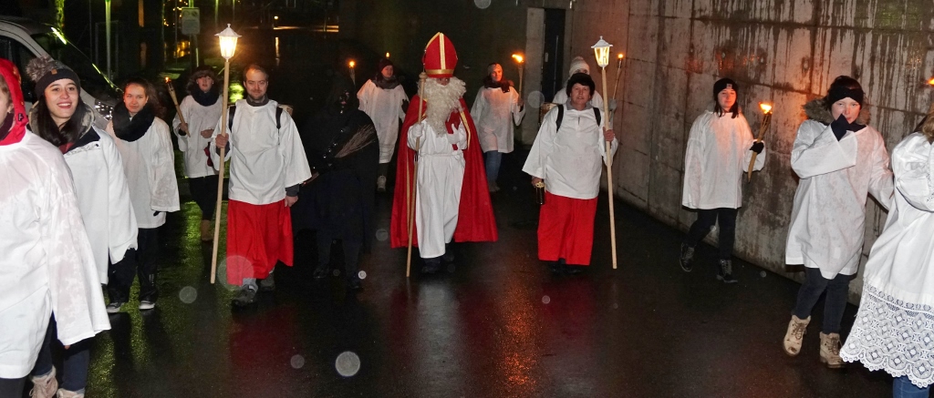 Alle haben es sich gewünscht, der Wolken verhangene Himmel bescherte uns dennoch kein trockenes Wetter zum Samichlauseinzug! Nichtsdestotrotz, die vielen Laternenlichter erhellten die dunkle Dorfstrasse und die Glocken, Trychlen und Geisslechlöpfer füllten die Ohren, als der Samichlaus mit seinem Gefolge vom Schulhaus Wauwil Richtung Kirche zog. Die Kindergartenkinder und Schülerinnen und Schüler der 1.-2. Klasse freuten sich, auf dem grossen Platz vor dem Pfarreiheim der Geschichte des Samichlaus zu lauschen, ihm die leuchtenden Laternen vorzustellen und das bestens eingeübte Samichlauslied zu singen!