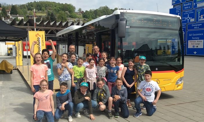 Im Anschluss an das Basisprogramm an Bord des rollenden Klassenzimmers folgte ein spezielles Modul rund ums Busfahren mit dem Team von PostAuto Schweiz AG.