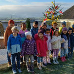 Mit einem traditionellen Aufrichte-Bäumchen wurde der neue Unterstand offiziell eingeweiht. Nun steht den Kindern ein geschützter Außenbereich zur Verfügung, der ganzjährig für Spiel- und Lernangebote genutzt werden kann.